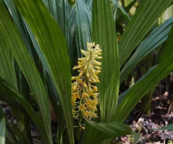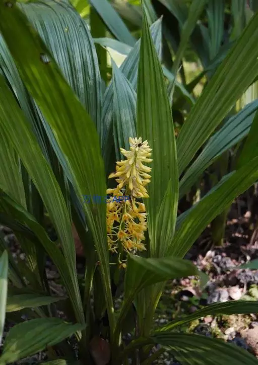 花葶粗壮,侧生,从茎的基部发出,长40厘米或更长,粗5-15厘米,从基部向上具数枚筒状鞘,最下面的1枚最小,长约1厘米,上面的1枚最长;总状花序在花蕾时为苞片所包而呈圆球状,随着花的开放,花序轴逐渐伸长而呈圆柱形;花苞片膜质,狭披针形,长达3.5厘米,在花开放时脱落;花鲜黄色;萼片近相似,卵状披针形,长9-12毫米,中部宽4-5毫米,先端渐尖,具5条脉。