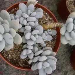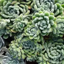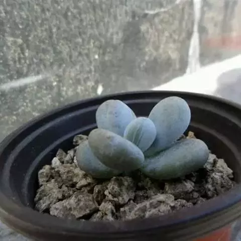 蓝黛莲是一种景天科厚叶草属植物。叶片呈略扁的圆柱形,排列成莲座状;颜色为灰绿色,…