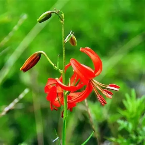 山丹百合(学名Lilium pumilum) 又名山丹花、山丹丹、珊瑚百合、线叶百合、细叶百合。因叶细而多,花冠似珊瑚得名。株秆高30~40厘米,茎上生叶50~80厘米,细小纤弱,狭长如松叶。花春末夏初开放,花下垂,花瓣向外反卷,色鲜红,有光泽。鳞茎卵形或圆锥形,鳞片矩圆形或长卵形。地上茎高达60~80厘米;有小乳头状突起,有的带紫色条纹。叶散生,多数集中在茎的中部,条形,长可达10厘米,中脉下面突出,边缘有乳头状突起。花朵排列成总状花序,有香味;花被鲜红色,通常无斑点,强烈反卷;蜜腺两边有乳头状突起;花丝长约2.5厘米,红色;子房长约1厘米,花柱约长于子房1倍;柱头膨大,3裂。蒴果矩圆形。花期7~8月份,果熟期9~10月份。