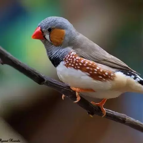 橙颊梅花雀体长约10厘米,头部灰色,两侧有大块橙色区域,嘴基及眼下方有黑纹,两条黑纹间呈白色,…