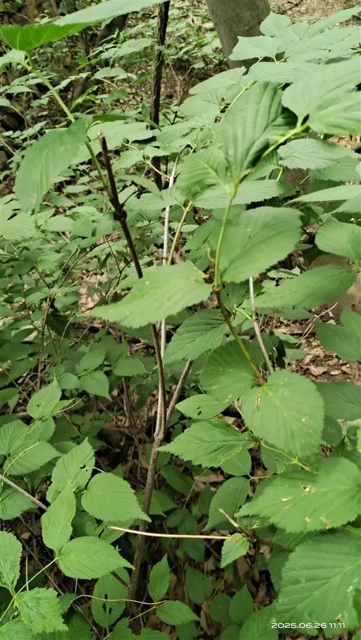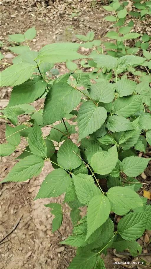 落叶灌木,高0.5-2米,稀达3米。小枝紫褐色,嫩枝绿色,光滑。叶对生,卵形,长 4-11厘米,宽3-6厘米,顶端渐尖,基部圆形至微心形,边缘有尖锐重锯齿,上面幼时被疏柔毛,以后脱落无毛,下面被绢状柔毛,老时脱落仅沿脉被稀疏柔毛;叶柄长2-5毫米,被疏柔毛;托叶膜质狭带形,被疏柔毛,不久脱落。