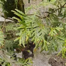 危害后榧叶边缘脱绿成黄褐色似铁锈。