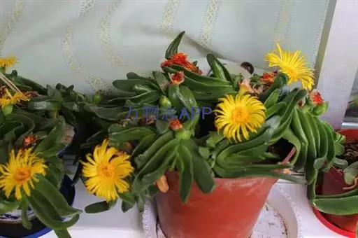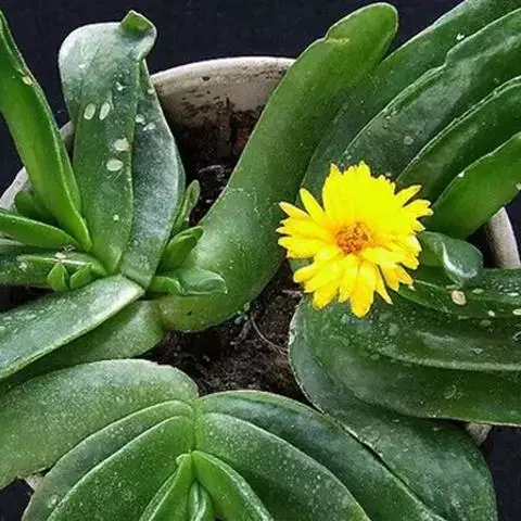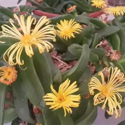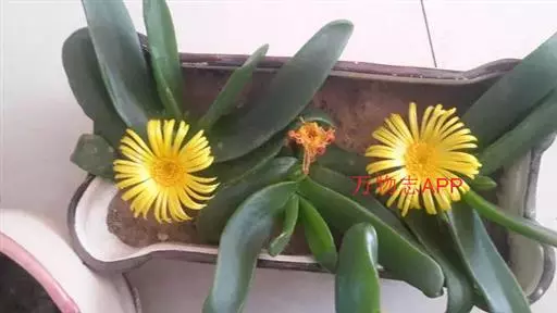 宝绿中文学名弯叶日中花,拉丁文名Mesembryanthemum uncatum Salm-Dyck,又名舌叶花、佛手掌。