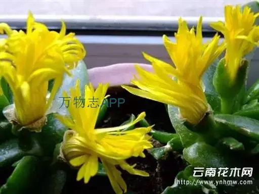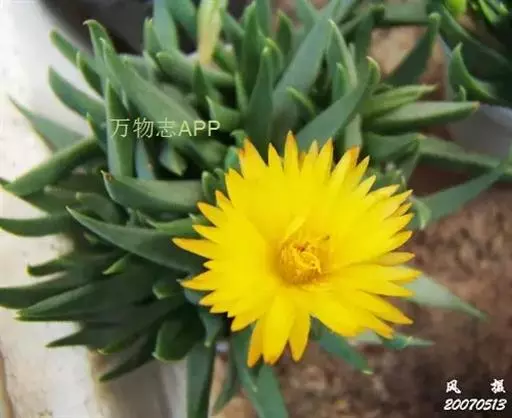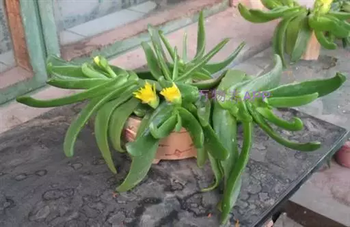 多年生,茎肉质,叉状分枝。叶片舌状或三角状线形,肥厚多肉,鲜绿色,交互对生,紧密排成2列,长约6厘米,宽约1.5厘米,顶端具钝弯钩,基部合生。花顶生,具细长梗,橙黄色,直径约2厘米;花瓣和雄蕊均多数;花托膨大。花期5-6月。