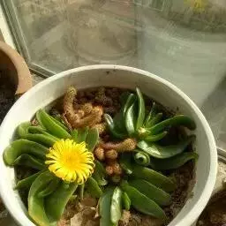 佛手掌叶片肥厚多汁,翠绿透明,形似翡翠,清雅别致。冬季正月开花,花朵金黄色,灼灼耀眼,古分惹人喜爱。佛手掌适宜盆栽,陈设在书桌、窗台、几案、小巧玲珑,非常雅致。