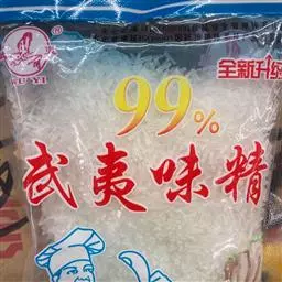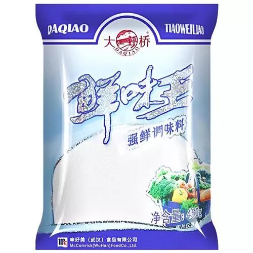 大桥牌强鲜味精是在99%颗粒味精的基础上,采用先进的覆膜技术生产的新一代鲜味调味料,将5’-鸟苷酸二钠均匀牢固地粘附在颗粒味精表面上,使其具有鲜度高、用量少、口感厚实、光洁透明等特点,深受消费者喜爱。