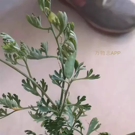 叶多皱缩破碎,暗绿色或灰绿色,有长柄;叶片二至三回羽状全裂,裂片纤细;柔软。花淡紫色,少见或已皱缩破碎。