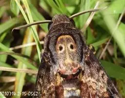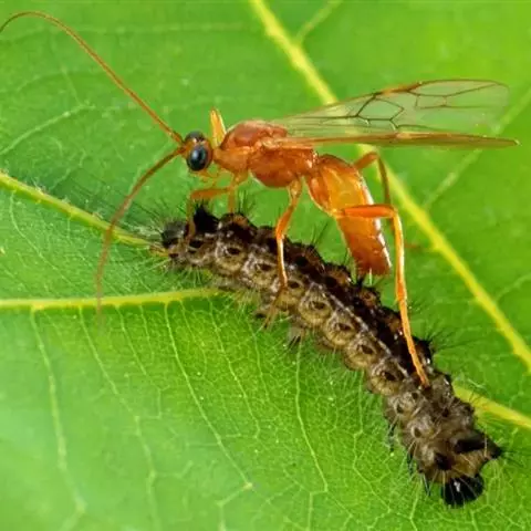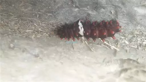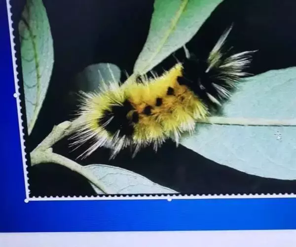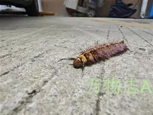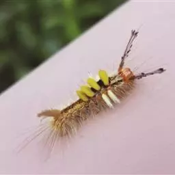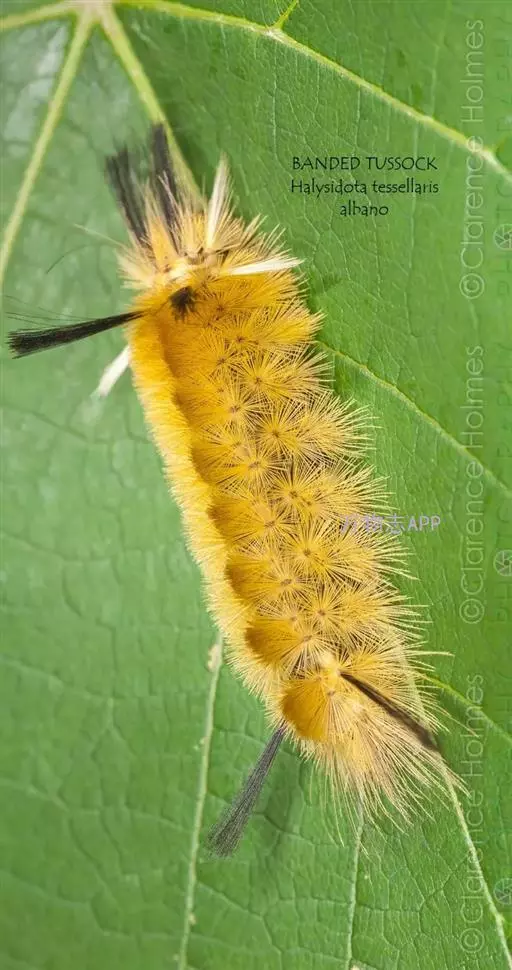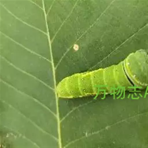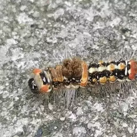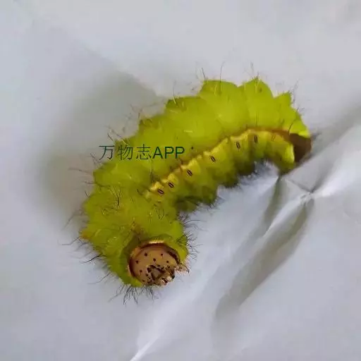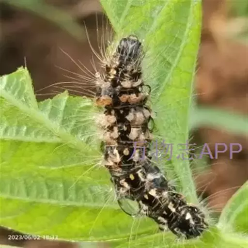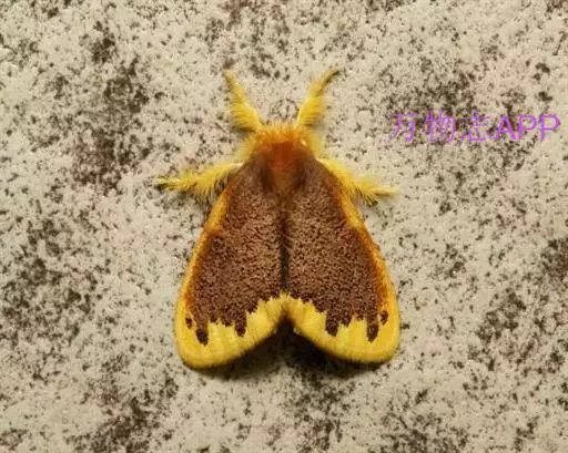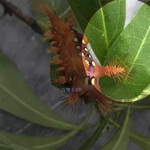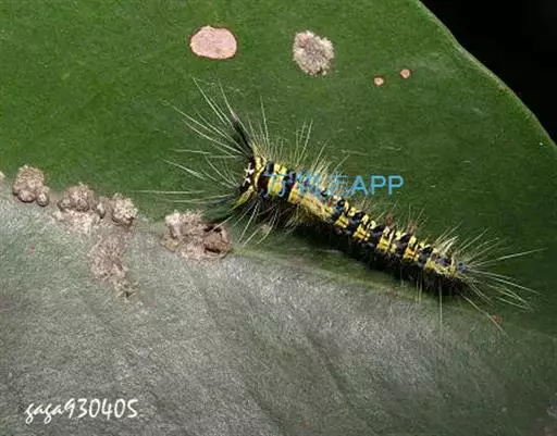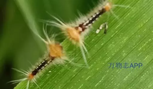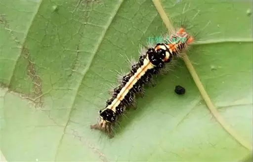 幼虫 体长25~40mm,第1、2腹节宽。头褐黑色,有光泽;体黑褐色,前胸背板黄色,具2条黑色纵线;体背面有一橙黄色带,在第1、2、8腹节中断,带中央贯穿一红褐间断的线;亚背线白色;气门下线红黄色;前胸背面两侧各有一向前突出的红色瘤,瘤上生黑色长毛束和自褐色短毛,其余各节背瘤黑色,生黑褐色长毛和白色羽状毛,第5、6腹节瘤橙红色,生有黑褐色长毛;腹部第1、2节背面各有1对愈合的黑色瘤,上生白色羽状毛和黑褐色长毛;第9腹节瘤橙色,上生黑褐色长毛。