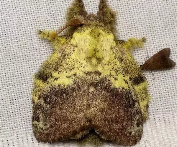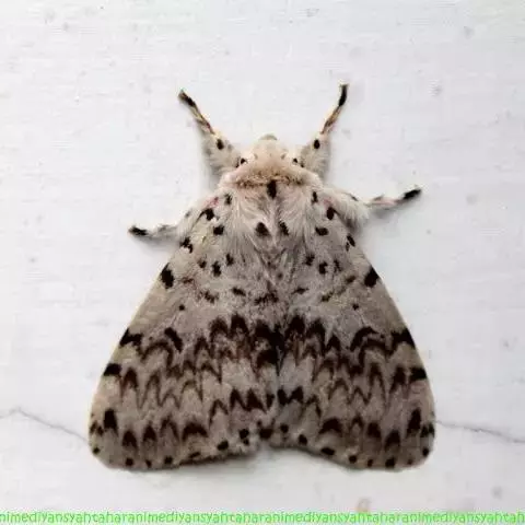 成虫雌体长18~20mm,雄体长14~16mm,翅展30~40mm。触角干白色,栉齿棕黄色;下唇须白色,外侧黑褐色;头、胸、腹部基半部和足白色微带黄色,腹部其余部分和脏毛簇黄色;前、后翅白色,前翅后缘有两个褐色斑,有的个体内侧褐色斑不明显;前、后翅反面白色,前翅前缘黑褐色。