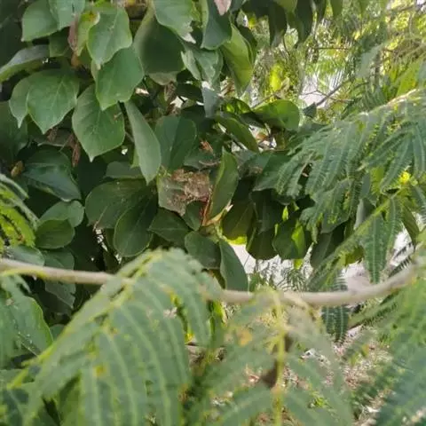 叶:山槐的叶二回羽状复叶,羽片2-4对、小叶5-14对,长圆形或长圆状卵形,长1.8 - 3.5厘米,宽7-17毫米,先端圆钝而有细尖头,基部不等侧,两面均被短柔毛,中脉稍偏于上侧。
