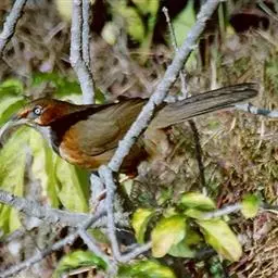 大噪鹛:中型鸟类,体长32-36厘米。额至头顶黑褐色,背栗褐色满杂以白色斑点,…