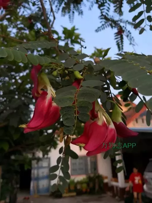 大花田菁(学名:Sesbania grandiflora (Linn.) Pers.)是豆科,田菁属一年生小乔木,高可达10米,枝斜展,叶痕及托叶痕明显。羽状复叶,叶轴圆柱,托叶斜卵状披针形。小叶长圆形至长椭圆形,先端圆钝至微凹,基部圆形至阔楔形,小托叶针状。总状花序,有花;苞片、小苞片卵形至卵状披针形,花大,花梗密被柔毛;花萼绿色,钟状,花冠白色、粉红色至玫瑰红色,旗瓣长圆状倒卵形至阔卵形,无胼胝体,翼瓣镰状长卵形,龙骨瓣弯曲,花药线形,雌蕊线形,扁平,荚果线形,种子红褐色,稍有光泽,椭圆形至近肾形,种脐圆形,9月至翌年4月开花结果。