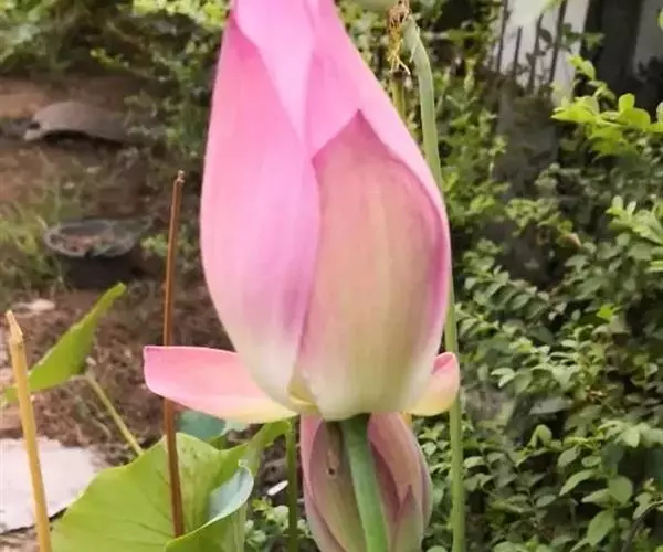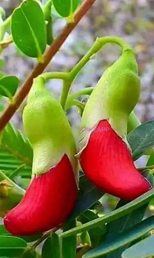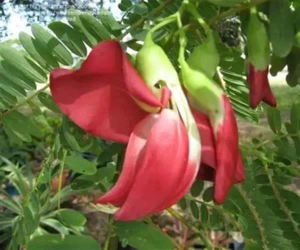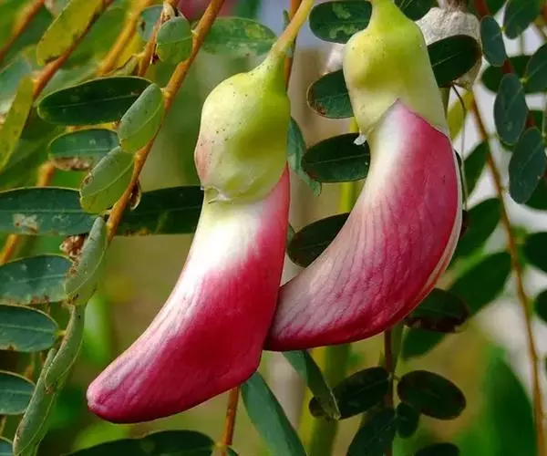 总状花序长4-7厘米,下垂,具2-4花;苞片、小苞片卵形至卵状披针形,长7-10毫米,两面均被柔毛,早落;花大,长7-10厘米,在花蕾时显著呈镰状弯曲;花梗长1-2厘米,密被柔毛;花萼绿色,有时具斑点,钟状,长1.8-2.9厘米,口部直径1.5-2厘米,常2齿,浅二唇形至近截形,除萼齿先端及内缘被毛外,余处无毛;花冠白色、粉红色至玫瑰红色,旗瓣长圆状倒卵形至阔卵形,长5-7.5厘米,宽3.5-5厘米,先端微凹,基部近心形,柄长约1.6厘米,无胼胝体,开花时反折,翼瓣镰状长卵形,不对称,长约5厘米,宽约2厘米,先端钝,柄长约2厘米;龙骨瓣弯曲,长约5厘米,下缘连合成舟状,先端约1/4-1/3分离,钝圆,瓣柄分离,长约2厘米;雄蕊二体,对旗瓣的1枚分离,长约9毫米,花药线形,长4-5毫米,背着;雌蕊线形,长约8厘米,扁平,镰状弯曲,无毛,具子房柄,柱头稍膨大。荚果线形,稍弯曲,下垂,长20-60厘米,宽7-8毫米,厚约8毫米,先端渐狭成喙,长3-4厘米,果颈长约5厘米,熟时缝线处有棱,开裂,种子红褐色,稍有光泽,椭圆形至近肾形,肿胀,稍扁,长约6毫米,宽3-4厘米,种脐圆形,微凹。花果期9月至翌年4月。