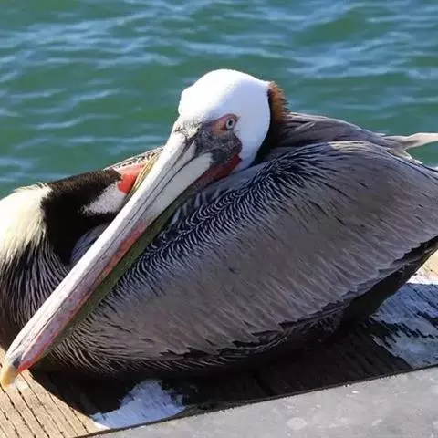 褐鹈鹕:是鹈鹕家族中体型最小的成员。体型粗大,体重6.5-9千克。嘴形宽大直长,上嘴尖端朝下弯曲,…