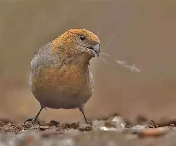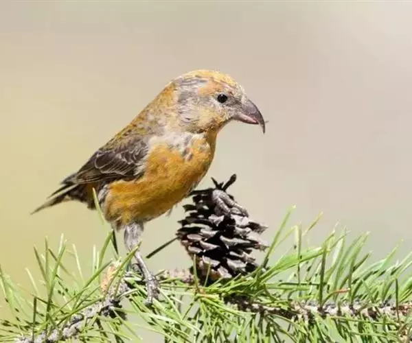 交嘴雀喜啄食大量的落叶松和云杉及冷杉的种子,倒悬进食,用交嘴嗑开松子。