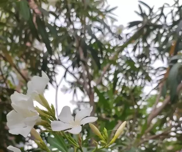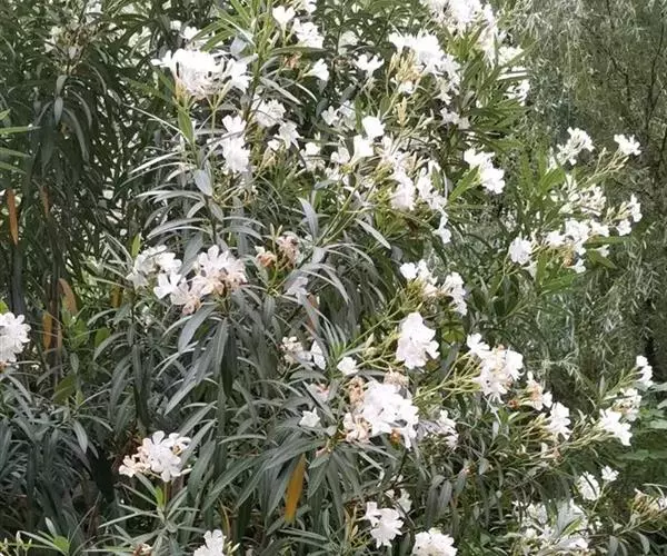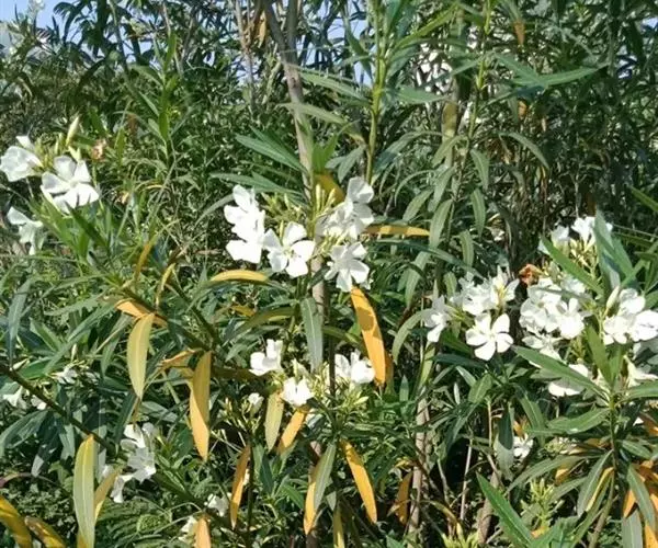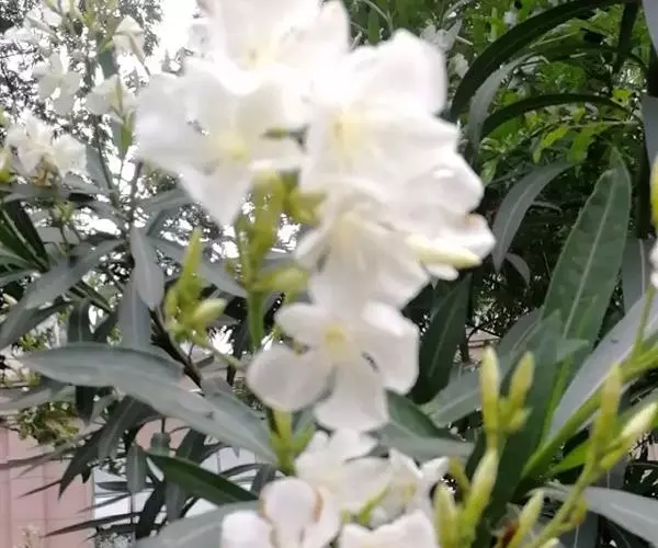 夹竹桃按颜色一般分为红花夹竹桃(Nerium indicum Mill.)、黄花夹竹桃(Thevetia peruviana(Pers.)K.Schum.)和白花 白花夹竹桃,摄于杭州西湖湖畔 夹竹桃三种,其中白花夹竹桃为人工栽培变种,在中国南北各地均有分布,以云南、广东、广西、河北等地多见,