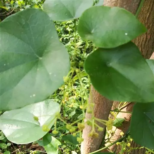千金藤又名小青藤。多年生落叶藤本,长可达5m。全株无毛。根圆柱状,外皮暗褐色,内面黄白色。老茎木质化,小枝纤细,有直条纹。叶互生;叶柄长5-10cm,盾状着生;叶片阔卵形或卵圆形,长4-8cm,宽3-7cm,先端钝或微缺,基部近圆形或近平截,全缘,上面绿色,有光泽,下面粉白色,两面无毛,掌状脉7-9条。花小,单性,雌雄异株;雄株为复伞形聚伞花序,总花序梗通常短于叶柄,小聚伞花序近无梗,团集于假伞梗的末端,假伞梗挺直;雄花:萼片6(-8),排成2轮,卵形或倒卵形;花瓣3(-4);雄蕊6,花丝合生成柱状。雌株也为复伞形聚伞花序,总花序梗通常短于叶柄,小聚伞花序和花均近无梗,紧密团集于假伞梗的端;雌花:萼片3(-4);花瓣3(-4);子房卵形,花柱3-6深裂,外弯。核果近球形,红色,直径约6mm,内果皮背部有2行高耸的小横肋状雕纹,每行通常10颗,胎座迹通常不穿孔。花期6-7月,果期8-9月。