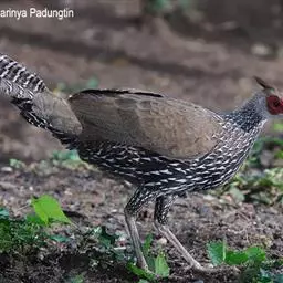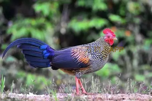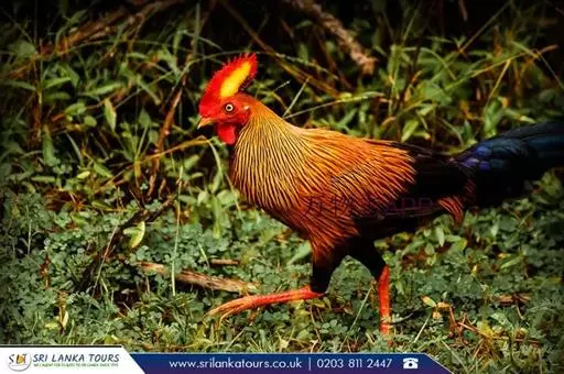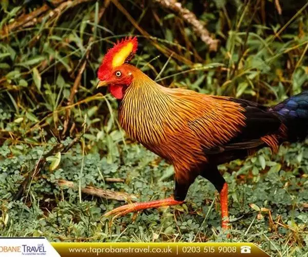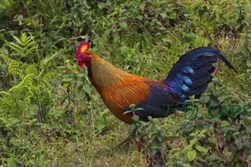 黑尾原鸡(学名:Gallus lafayetii):雄鸟体型较大,体羽艳丽且金属光泽;脸部裸皮、有红色肉冠及肉垂,大而显著;中央两枚尾羽延长,下垂如镰刀状。雌性较小,体色单一,羽毛呈深褐色,下颈部及胸部有一些白斑。