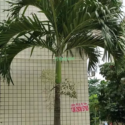 挖苗木时可保留4-7片叶,运输前应把枝叶向上包好,保护好尾梢。用编织袋将士球包严,再用绳子打网状将编织袋缠紧。随掘、随运、随到,随栽植。栽植前,先根据设计定点定位挖种植穴,穴直径比土球直径大1/3左右,深度比土球高度大20厘米左右,在挖好的种植穴基部填入肥沃的细土。栽植时,取出植株包裹土球的包装物,逐层填入肥沃细土,每填入厚度30厘米的细土要用粗棍盅实一次。待差约10-15厘米填满时灌入清水,让填土及土球吸透水分,再将余土填上,直到树干基部稍呈鼓凸状为止。栽植完成后应立即立支柱支撑植株,假槟榔树冠体积相对较小,加之事先已对其进行修剪,因此使用矮三角术架支撑即可。