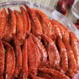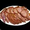 3.腌制好的肉片从酱汁里捞出,放到干净的盘子里在阴凉的地方晾一下,但不能放到阳光下晒,晾干的程度为酱汁在肉片上形成一层肉膜为宜。腌好肉片的酱汁千万不要倒掉,放好下面要用!