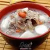 2.汤锅内添上黄豆芽白汁及高汤,将佐料放入布袋中投入汤锅内,放干红椒、葱段、姜、精盐、味精、汤烧沸,放兰花干、海带结、素鸡片、豆筋,旺火煮2.5小时,再放把子肉块、四喜丸子、鸡蛋角、面筋肋同煮1小时,后压炉火。根据顾客需要选配。
