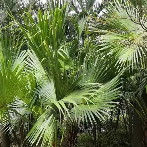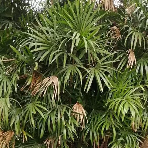 细叶棕竹,灌木,茎细如竹,多数聚生,有网状叶鞘。叶半圆形,掌状深裂,裂片狭长,阔线形,软垂,裂片7…