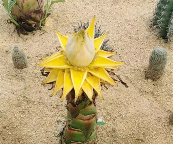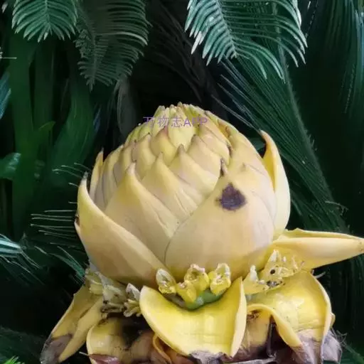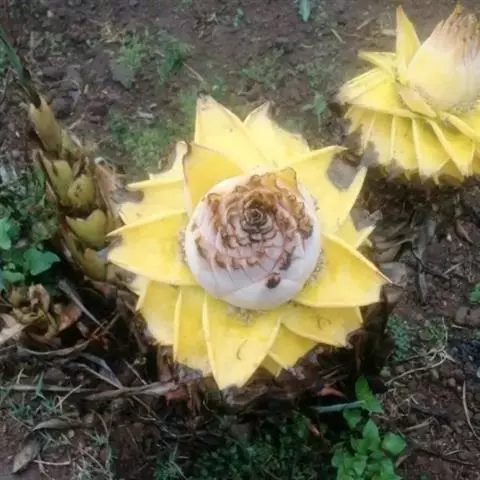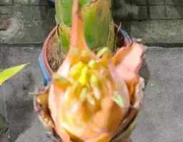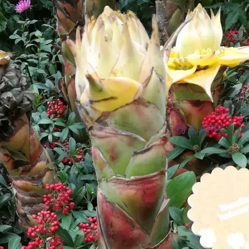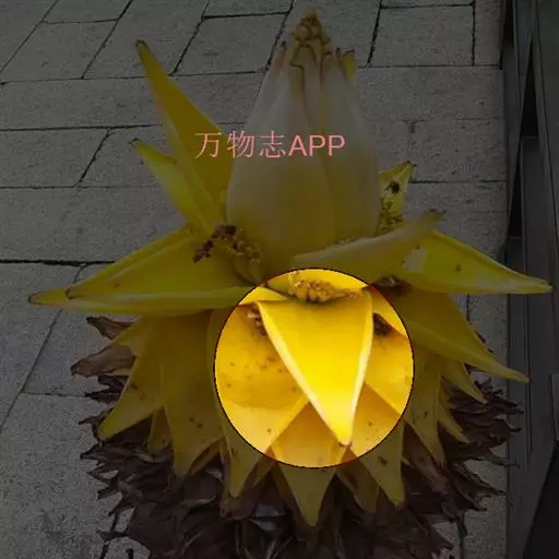 花序直立,直接生于假茎上,密集如球穗状,长20-25厘米,苞片干膜质,黄色或淡黄色,有花2列,每列4-5花;合生花被片卵状长圆形,先端具5 (3+2) 齿裂,离生花被片先端微凹,凹陷处具短尖头。