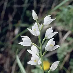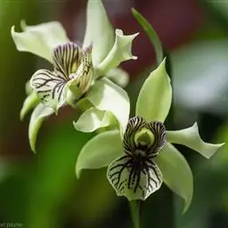 花序侧生于茎的基部,长达50厘米,不分枝或有时分枝;花序柄绿色,粗4-5毫米,被数枚鳞片状鞘;花序轴紫绿色,多少回折状,常具数朵由基部向顶端逐朵开放的花;花苞片卵状三角形,长3-5毫米;花梗连同子房绿色,纤细,长2.5-4.5厘米;花白色,美丽,花期长;中萼片近椭圆形,长2.5-3厘米,宽1.4-1.7厘米,先端钝,基部稍收狭,具网状脉;侧萼片歪卵形,长2.6-3.5厘米,宽1.4-2.2厘米,先端钝,基部收狭并贴生在蕊柱足上,具网状脉;花瓣菱状圆形,长2.7-3.4厘米,宽2.4-3.8厘米,先端圆形,基部收狭呈短爪,具网状脉;唇瓣3裂,基部具长约7-9毫米的爪;侧裂片直立,倒卵形,长2厘米,先端圆形或锐尖,基部收狭,具红色斑点或细条纹,在两侧裂片之间和中裂片基部相交处具1枚黄色肉突;中裂片似菱形,长1.5-2.8厘米,宽1.4-1.7厘米,先端渐狭并且具2条长8-18毫米的卷须,基部楔形;蕊柱粗壮,长约1厘米,具宽的蕊柱足;花粉团2个,近球形,每个劈裂为不等大的2爿。花期4-6月。