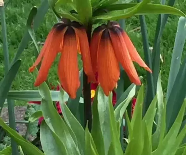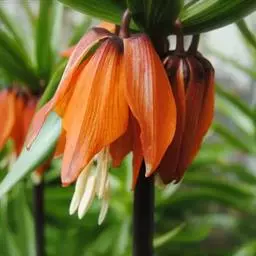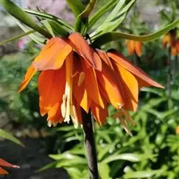 具被膜鳞茎,直径可达15cm。有数枚鳞片。茎高60-120cm,多叶。植株带臭鼬所味。叶互生,披针形,长15cm。花被片6,分离,红橙色,下垂,多数轮生于顶生总花梗上端,梗顶叶丛之下。有黄色花、橙红大花、大红大花、硫黄色花等园艺品种。花期5-6月。