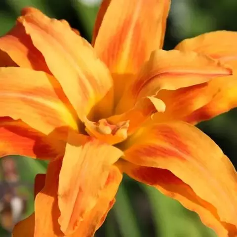 多年生草本,根状茎粗短,具肉质纤维根,多数膨大呈窄长纺锤形。叶基生成丛,条状披针形,长30~60cm,宽约2.5cm,背面被白粉。夏季开橘黄色大花,花葶长于叶,高达1m以上;圆锥花序顶生,有花6~12朵,花梗长约1cm,有小的披针形苞片;花长7~12cm,花被基部粗短漏斗状,长达2.5cm,花被6片,开展,向外反卷,外轮3片,宽1~2cm,内轮3片宽达2.5cm,边缘稍作波状;雄蕊6,花丝长,着生花被喉部;子房上位,花柱细长。