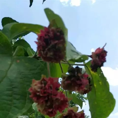 伞房状聚伞花序顶生或腋生,通常二歧分枝,疏散,末次分枝着花3朵,花序长8-18厘米,花序梗长3-6厘米,多少被黄褐色柔毛或无毛;苞片叶状,椭圆形,早落;花萼蕾时绿白色,后紫红色,基部合生,中部略膨大,有5棱脊,顶端5深裂,裂片三角状披针形或卵形,顶端尖;花香,花冠白色或带粉红色,花冠管细,长约2厘米,顶端5裂,裂片长椭圆形,长5-10毫米,宽3-5毫米;雄蕊4,花丝与花柱同伸出花冠外;花柱较雄蕊短,柱头2裂。核果近球形,径6-8毫米,包藏于增大的宿萼内,成熟时外果皮蓝紫色。花果期6-11月。