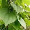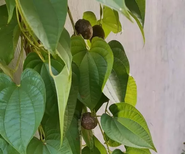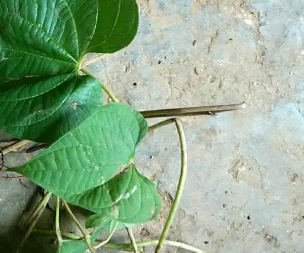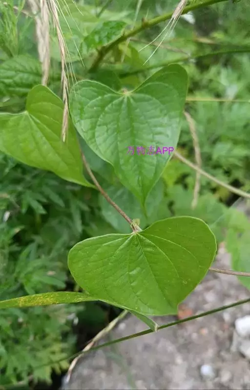多年生草本野生藤蔓植物。块茎卵圆形或梨形,外皮紫黑色,密布须根,茎左旋,单叶互生,广心状形,基部宽心形,先端长尾状,叶全缘,单性花,雄花序穗状下垂,丛生于叶腋、花小密集,浅绿白色;雌花紧贴中轴,茎中结有若干卵圆形小球,似山药豆。