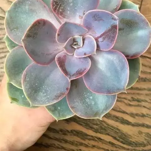 吉玛利亚,中小型品种,植株莲座型紧密排列,叶肥厚倒卵形,叶尖急尖,略披薄粉,叶色粉青到粉蓝,叶尖叶缘易变红,出状态时植株粉嫩, 叶缘叶背多出变红。