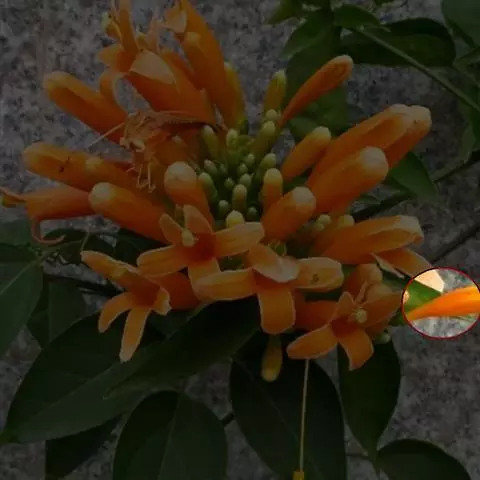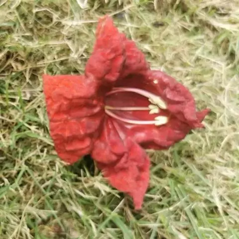 花冠筒细长,漏斗状,橙红色至鲜红色,筒部为花萼长的3倍,约6-9厘米,直径约4厘米。蒴果长圆柱形,长8-12厘米,顶端具喙尖,沿缝线具龙骨状突起,粗约2毫米,具柄,硬壳质。