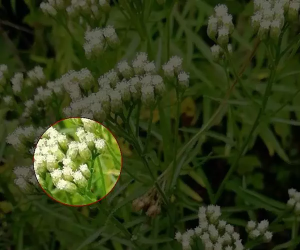 花白色,多朵组成稠密的聚伞花序,顶生,被柔毛;总花梗长4-7cm;花梗长约1mm;花冠高脚碟状,花冠筒长6-10mm,中部以上膨大,内面被柔毛,裂片在花蕾时或裂片基部向左覆盖,长圆形或卵状长圆形,长2-4mm,宽2-3mm;雄蕊长圆形,长约1mm,着生在花冠筒膨大处,内藏;子房由2枚离生心皮组成,密被柔毛,花柱丝状,长4.5mm,柱头棍棒状,顶端2深裂;花盘环状。