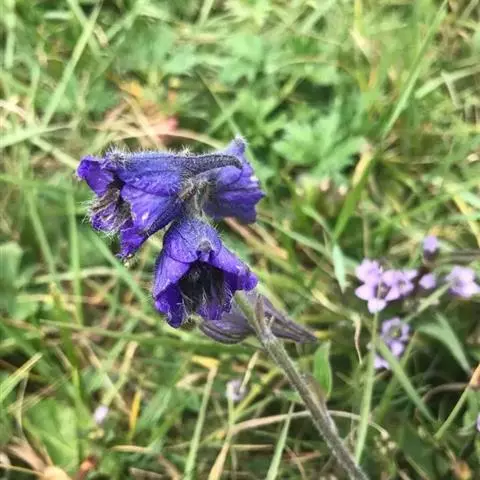 顶生总状花序长6-10厘米;轴及花梗多少密被反曲而紧贴的短柔毛;下部苞片三裂,其他的狭卵形至披针形;花梗长1.5-3厘米;小苞片生花梗中部或下部,长3-5毫米,宽0.5-0.8毫米;萼片蓝紫色,外面被短柔毛,上萼片高盔形,高2-2.6厘米,自基部至喙长1.7-2.2厘米,下缘稍凹,喙不明显,侧萼片长1.5-2厘米;花瓣无毛,瓣片长约1.1厘米,唇长约6毫米,微凹,距长2-2.5毫米,通常拳卷;雄蕊无毛或疏被短毛,花丝有2小齿或全缘;心皮3-5,子房疏或密被短柔毛,稀无毛。蓇葖长1.5-1.8厘米;种子长3-3.2毫米,三棱形,只在二面密生横膜翅。