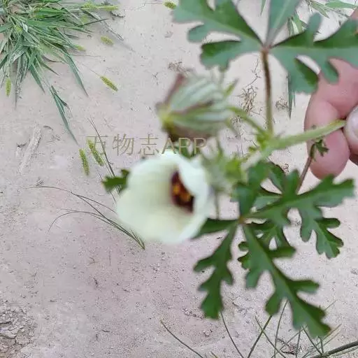 一年生直立或平卧草本,高25-70厘米,茎柔软,被白色星状粗毛。叶二型,下部的叶圆形,不分裂,上部的叶掌状3-5深裂,直径3-6厘米,中裂片较长,两侧裂片较短,裂片倒卵形至长圆形,通常羽状全裂,上面疏被粗硬毛或无毛,下面疏被星状粗刺毛;叶柄长2-4厘米,被星状粗硬毛和星状柔毛;托叶线形,长约7毫米,被星状粗硬毛。花单生于叶腋,花梗长约2.5厘米,果时延长达4厘米,被星状粗硬毛;小苞片12,线形,长约8毫米,被粗长硬毛,基部合生;花萼钟形,淡绿色,长1.5-2厘米,被粗长硬毛或星状粗长硬毛,裂片5,膜质,三角形,具纵向紫色条纹,中部以上合生;花淡黄色,内面基部紫色,直径2-3厘米,花瓣5,倒卵形,长约2厘米,外面疏被极细柔毛;雄蕊柱长约5毫米,花丝纤细,长约3毫米,花药黄色;花柱枝5,无毛。蒴果长圆状球形,直径约1厘米,被粗硬毛,果爿5,果皮薄,黑色;种子肾形,黑色,具腺状突起。花期7-10月。