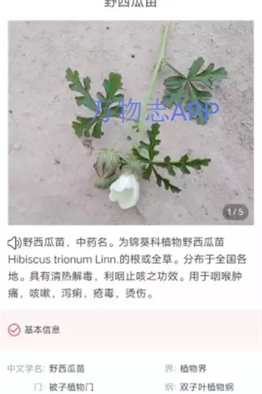 野西瓜苗,中药名。为锦葵科植物野西瓜苗Hibiscus trionum Linn.的根或全草。分布于全国各地。具有清热解毒,利咽止咳之功效。用于咽喉肿痛,咳嗽,泻痢,疮毒,烫伤。