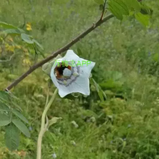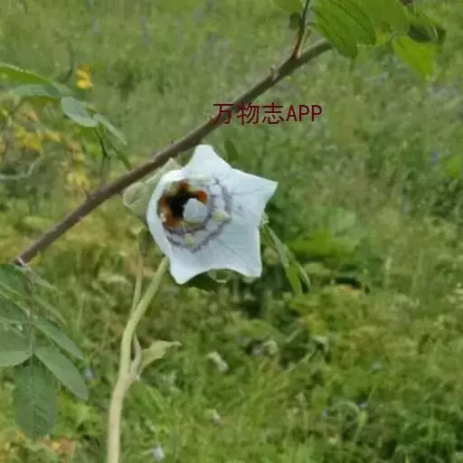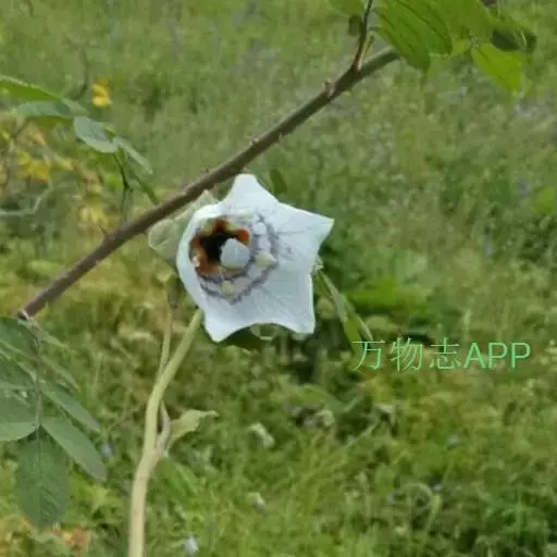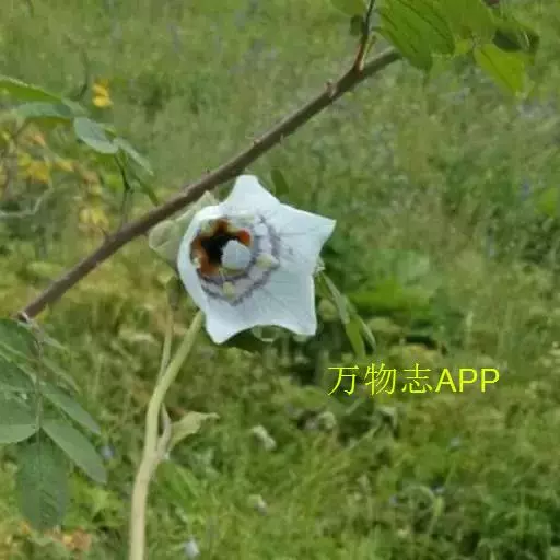 花单生于茎及分枝的顶端;花梗长,灰绿色,疏生短小的白色硬毛;花萼贴生至子房中部,筒部半球状,具10条明显辐射脉,绿色,有白粉,无毛或微被白色硬毛;裂片间湾缺尖狭,紧接,裂片卵形、椭圆形或卵状披针形,顶端急尖,全缘,长约1.5-2厘米,宽约6-8毫米,蓝灰色,无毛或顶端微具短柔毛;花冠阔钟状,长约2.8厘米,直径约2.6厘米,淡蓝色而具深蓝色花脉,内部常有紫斑,无毛;雄蕊无毛,花丝基部微扩大,花药矩圆状,各长约5-6毫米。在蒴果上宿存的花萼裂片极度长大,并向外反卷。