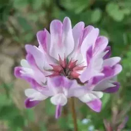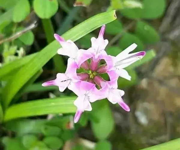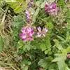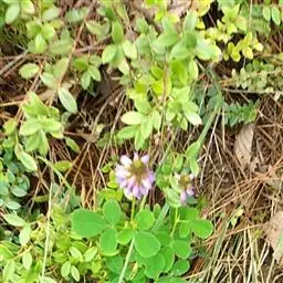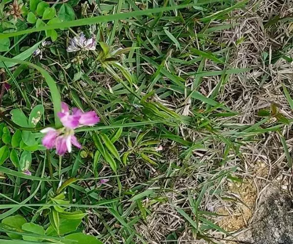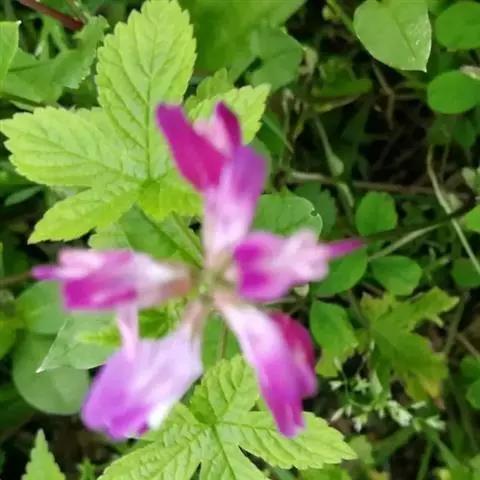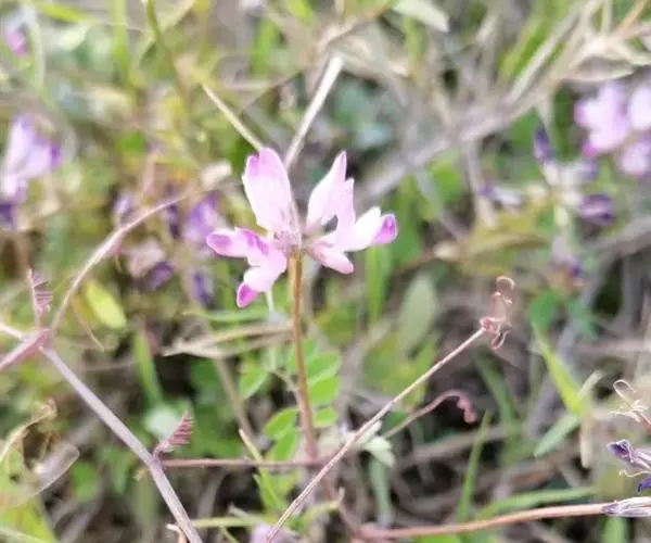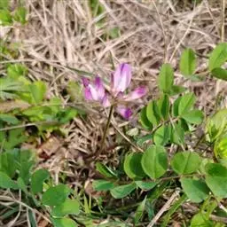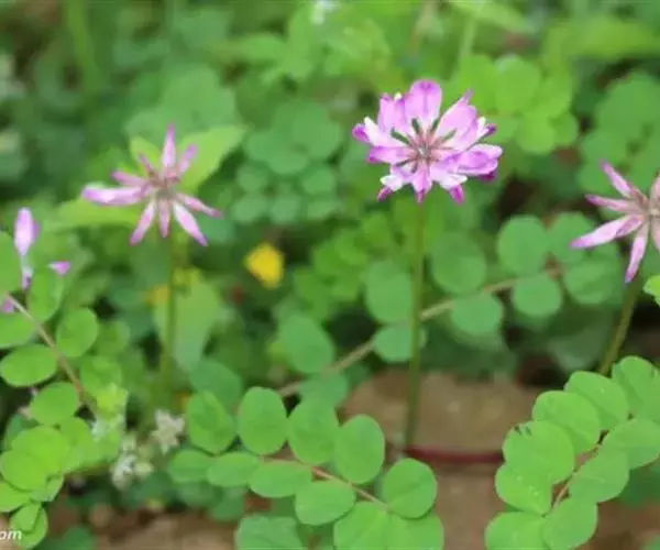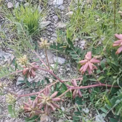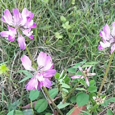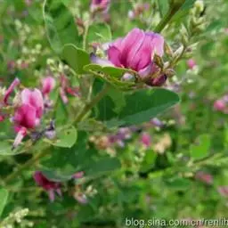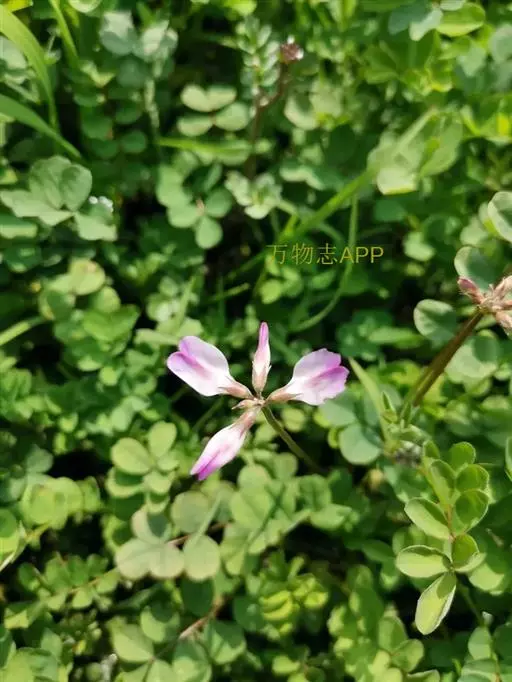 总状花序生5-10花,呈伞形;总花梗腋生,较叶长;苞片三角状卵形,长约0.5毫米;花梗短;花萼钟状,长约4毫米,被白色柔毛,萼齿披针形,长约为萼筒的1/2;花冠紫红色或橙黄色,旗瓣倒卵形,长10-11毫米,先端微凹,基部渐狭成瓣柄,翼瓣较旗瓣短,长约8毫米,瓣片长圆形,基部具短耳,瓣柄长约为瓣片的1/2,龙骨瓣与旗瓣近等长,瓣片半圆形,瓣柄长约等于瓣片的1/3;子房无毛或疏被白色短柔毛,具短柄。