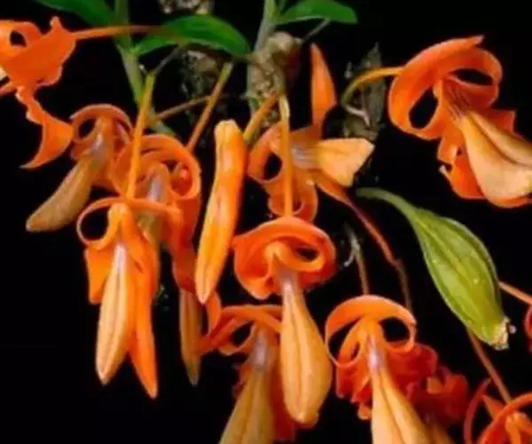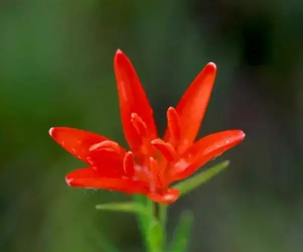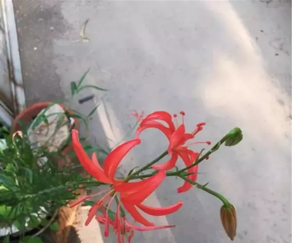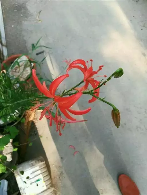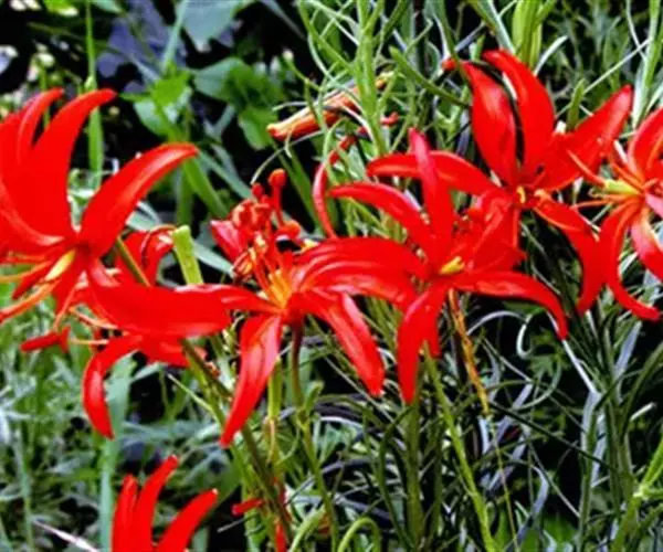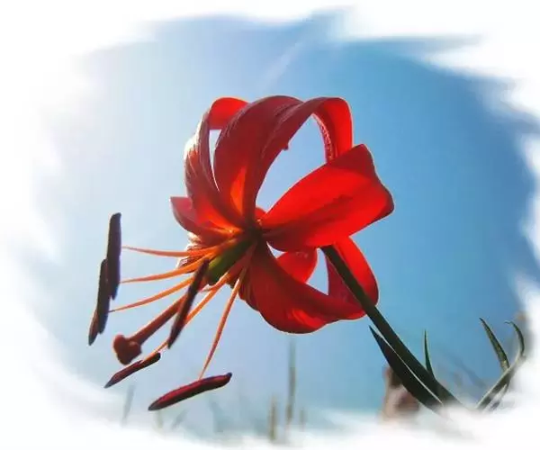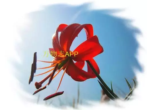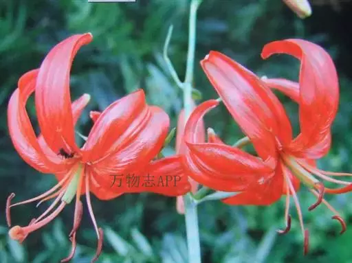 山丹百合 鳞茎卵形或圆锥形,高2.5-4.5厘米,直径2-3厘米;鳞片矩圆形或长卵形,长2-3.5厘米, 宽1-1.5厘米,白色。茎高15-60厘米,有小乳头状突起,有的带紫色条纹。叶散生于茎中部,条形,长3.5-9厘米,宽1.5-3毫米,中脉下面突出,边缘有乳头状突起。花单生或数朵排成总状花序,鲜红色,通常无斑点,有时有少数. 斑点,下垂;花被片反卷,长4-4.5厘米,宽0.8-1.1厘米,蜜腺两边有乳头状突起;花丝长1.2-2.5厘米,无毛,花药长椭圆形,长约1厘米,黄色,花粉近红色;子房圆柱形,长0.8-1厘米;花柱稍长于子房或长1倍多,长1.2-1.6厘米,柱头膨大,径5毫米,3裂。蒴果矩圆形,长2厘米,宽1.2-1.8厘米。花期7-8月,果期9-10月。