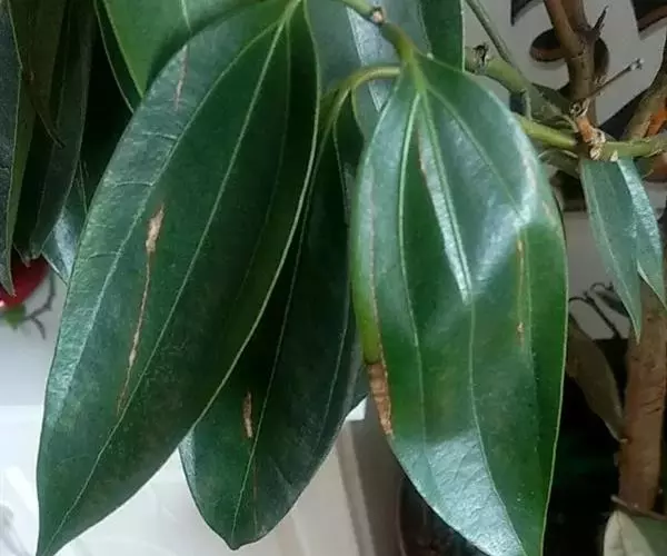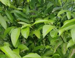 常绿乔木,高约15米,叶、枝及树皮干时几不具芳香气。枝条及小枝褐色,圆柱形,无毛。叶对生或近对生,卵圆形至长圆状卵圆形,长8-11(14)厘米,宽4-5.5(9)厘米,先端锐尖,基部圆形,革质,上面鲜时绿色,干时灰绿色,光亮,下面近同色,晦暗,两面无毛,具离基三出脉,侧脉自叶基约1厘米处生出,近叶片3/4处渐消失或不明显网结,有时近叶缘一侧各有一条附加的侧脉,细脉两面明显,呈浅蜂巢状网结;叶柄长约1.5厘米,腹凹背凸,红褐色或褐色。