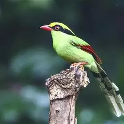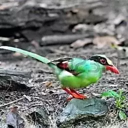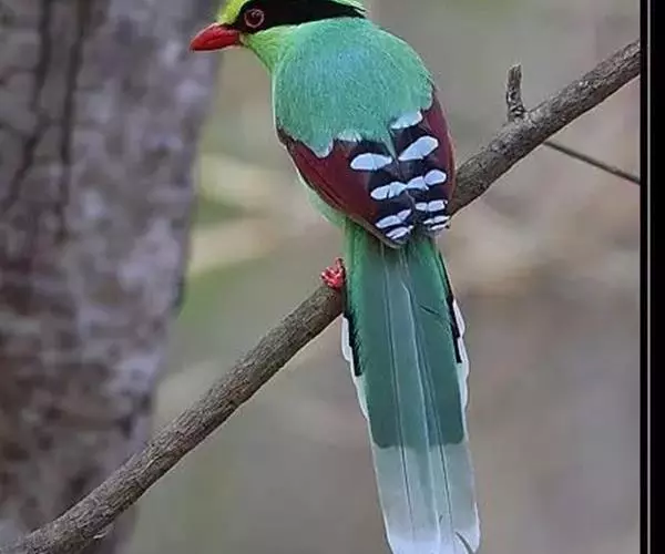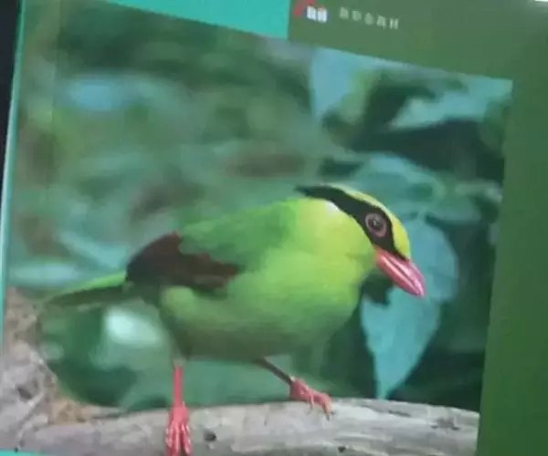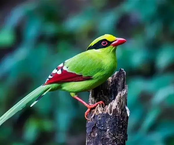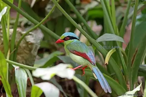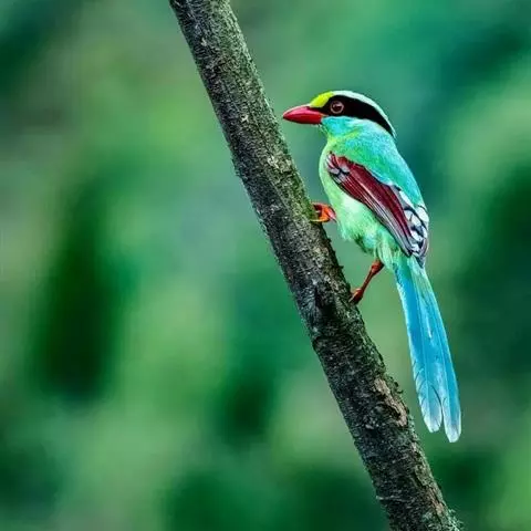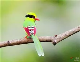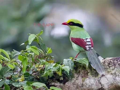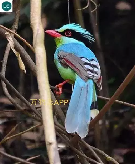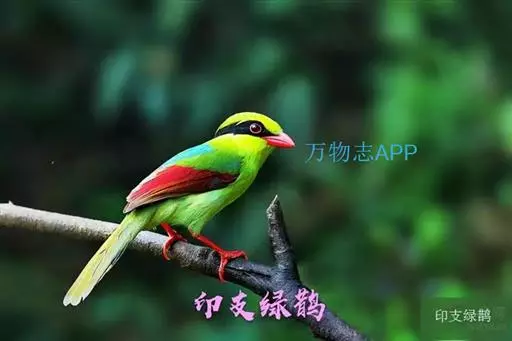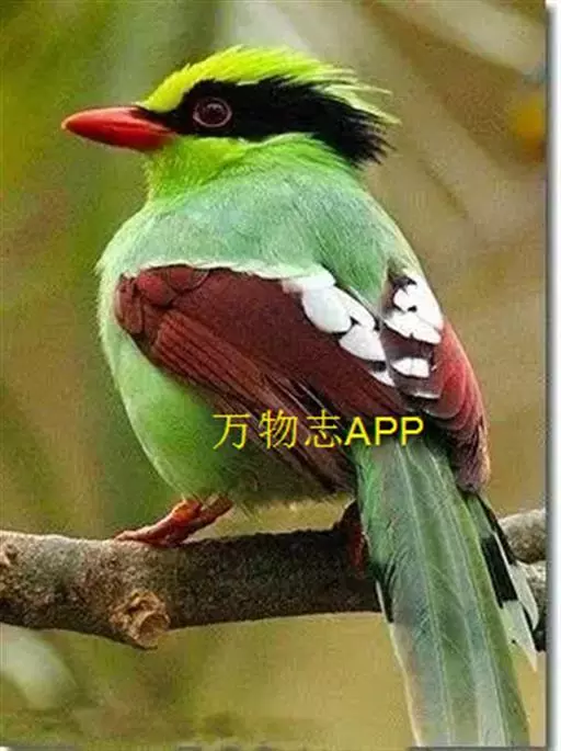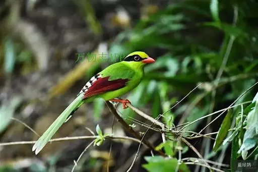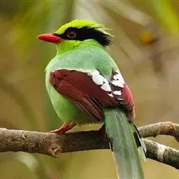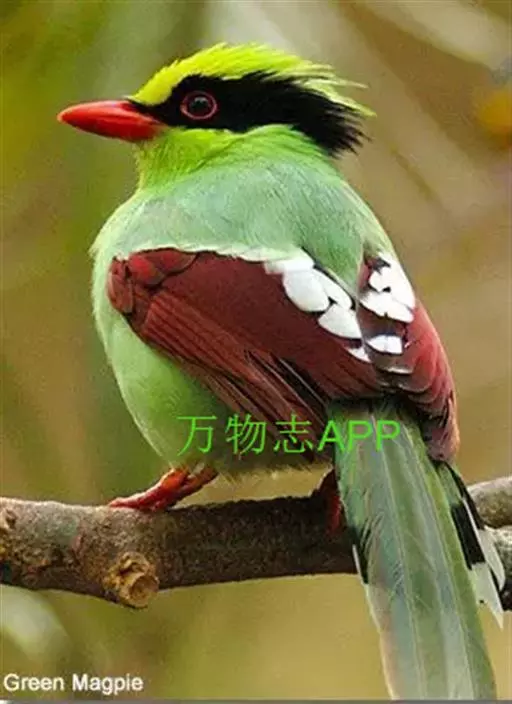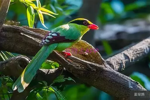 蓝绿鹊(学名:Cissa chinensis):中型鸟类,共有5个亚种。体长36-38厘米。尾长,嘴、脚红色。通体羽色主要为草绿色,宽阔的黑色贯眼纹向后延伸到后颈,在绿色的头侧极为醒目。两翅栗红色,内侧飞羽具黑色次端斑和白色尖端。尾绿色,具黑色次端带斑和白色尖端。