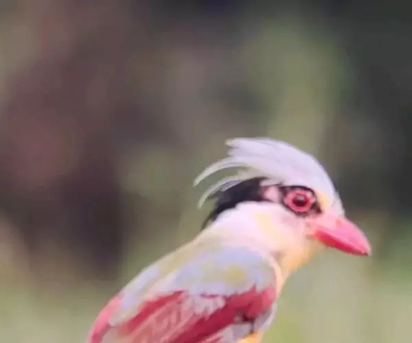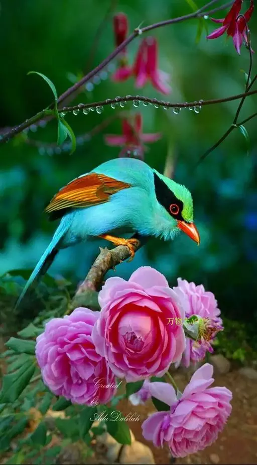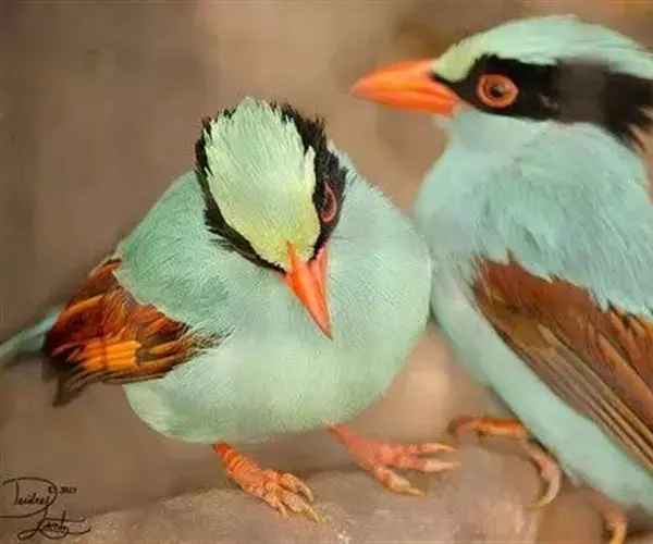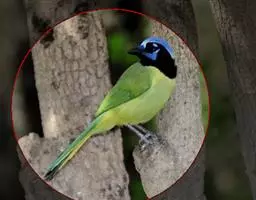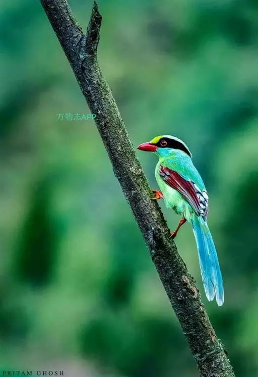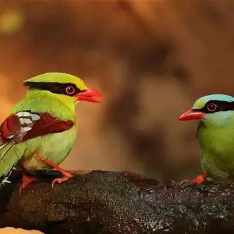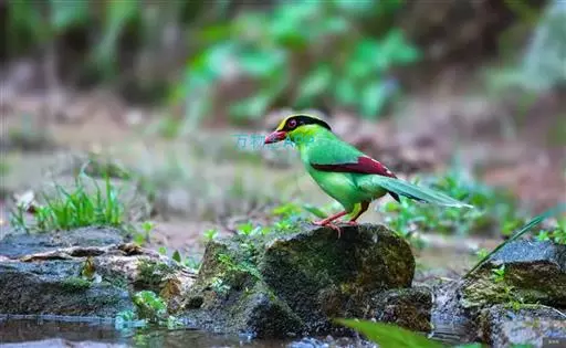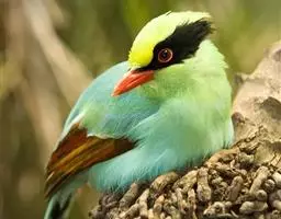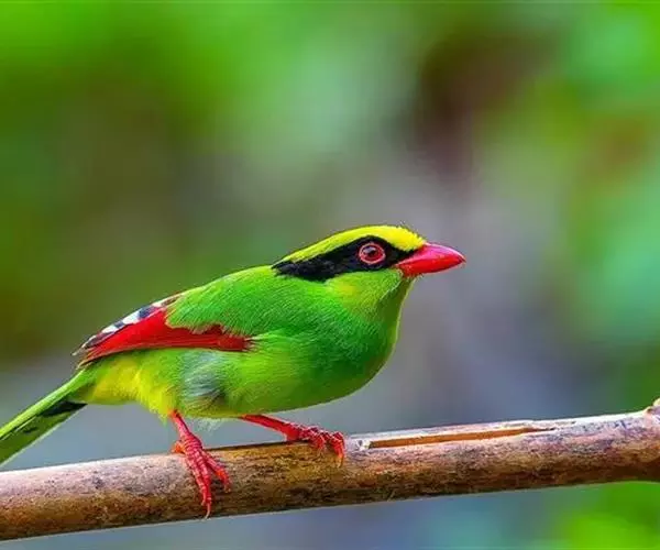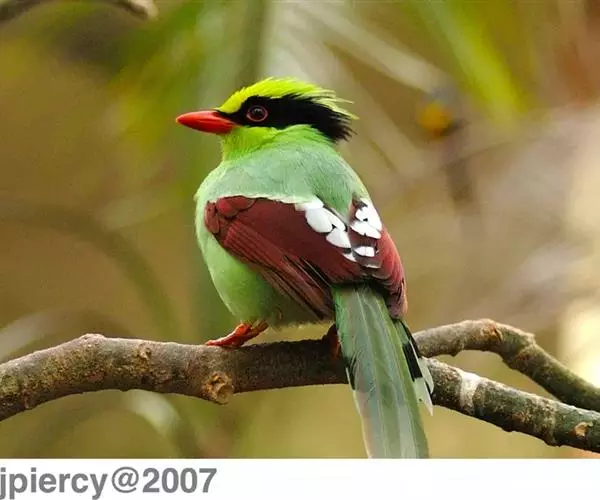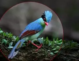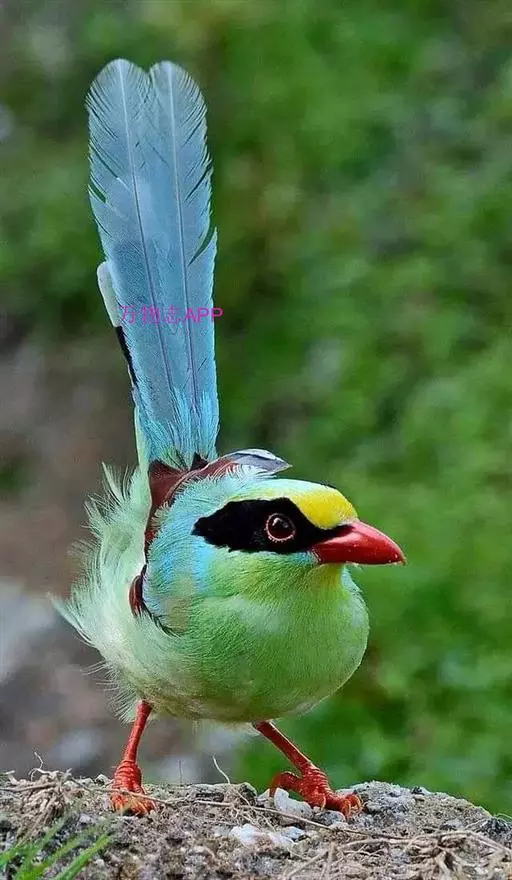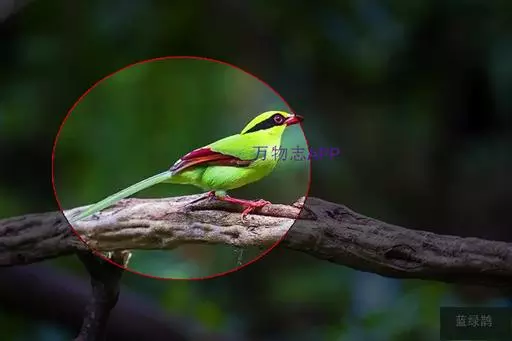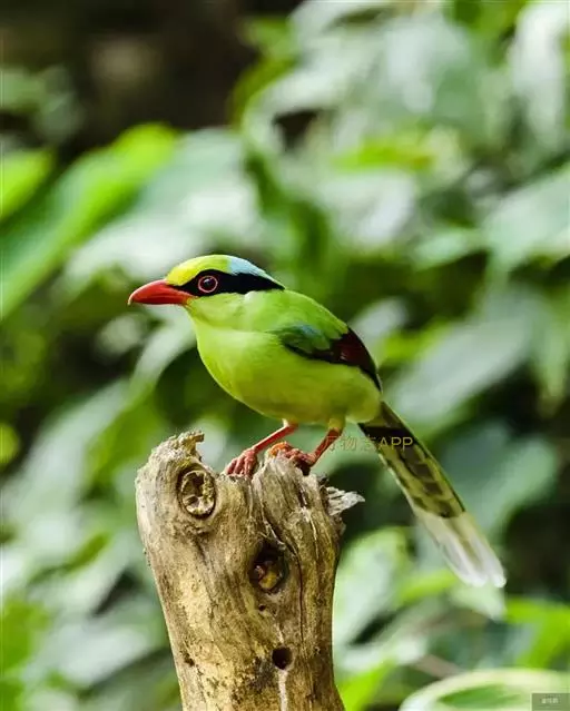 蓝绿鹊(学名:Cissa chinensis):中型鸟类,共有5个亚种。体长36-38厘米。尾长,嘴、脚红色。通体羽色主要为草绿色,宽阔的黑色贯眼纹向后延伸到后颈,在绿色的头侧极为醒目。两翅栗红色,内侧飞羽具黑色次端斑和白色尖端。尾绿色,具黑色次端带斑和白色尖端。
