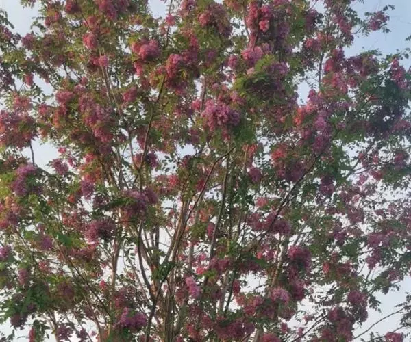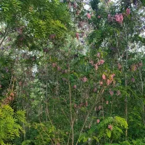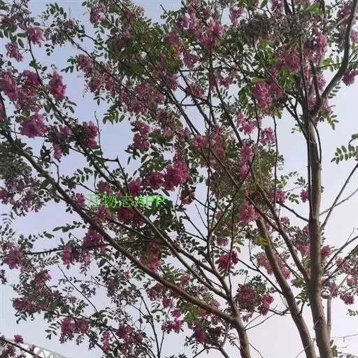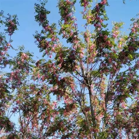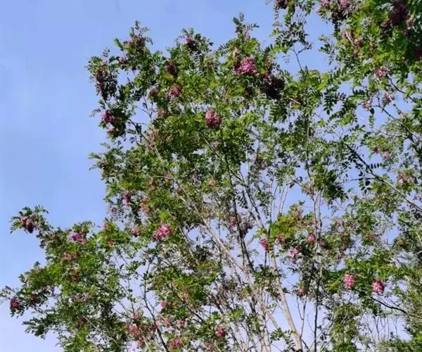 红花洋槐树体高大,叶色鲜绿,春季开花时节玫粉色花挂满枝头,芳香四溢。花为蜜源,木材质硬,耐腐。适宜庭园、道路绿化种植;也是工矿区绿化及荒山荒地造林的理想树种之一。