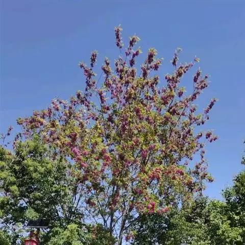 红花刺槐花大色美,呈小乔木状,可作行道树。
