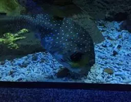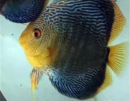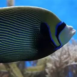 额斑刺蝶鱼,体卵圆形侧扁,有鲜明蓝色轮廓和数条鲜蓝竖纹,全身密布网格状具蓝色边缘的珠状黄点,深蓝色…