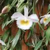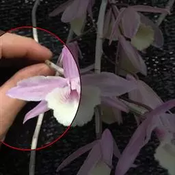 串珠石斛(学名:Dendrobium falconeri Hook.):茎悬垂,肉质,细圆柱形,近中部或中部以上的节间常膨大,多分枝,在分枝的节上通常肿大而成念珠状。叶薄革质,常2-5枚,互生于分枝的上部,狭披针形。总状花序侧生,常减退成单朵;花大,开展,质地薄,很美丽;萼片淡紫色或水红色带深紫色先端;花瓣白色带紫色先端,卵状菱形,长2.9-3.3厘米,宽1.4-1.6厘米,先端近锐尖,基部楔形,具5-6条主脉和许多支脉;唇瓣白色带紫色先端,卵状菱形。花期5-6月。