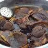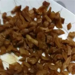 8.另起油锅,入花椒煎炸至花椒变色后,热油倒在肉片上。
