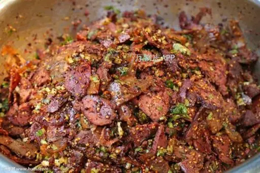 3. 用剩余的植物油烧开,淋在肉片上,使热油把干辣椒、花椒粉、肉片再炸一下,即可使麻、辣、浓香四溢。